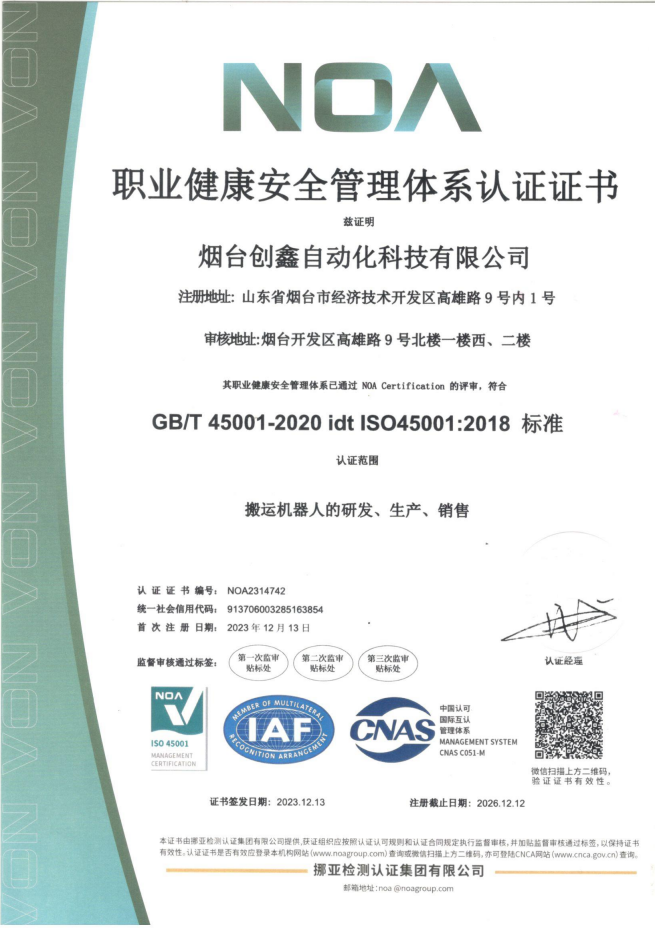 职业健康安全管理体系认证证书